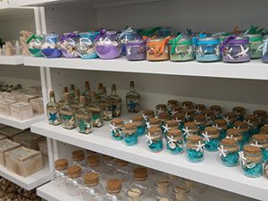 Colorful name-drop sand mementos line some shelves at Beach Bazaar.