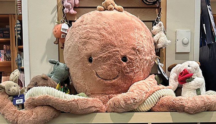 Tate & Tilly also employs a stuffed octopus that retails for about $800 as a display fixture. It hovers over a display of plush, books and related products from the brand, with a cubby system making finding a stuffie super convenient.