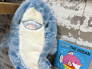 Tate & Tilly showcases a shark plush alongside a sea-themed book.