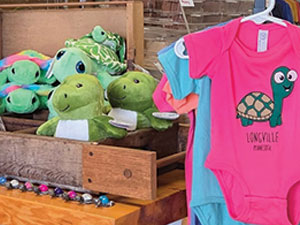 Turtle plush help to accent display tables with related turtle-themed merchandise at Lazy Days of Longville.